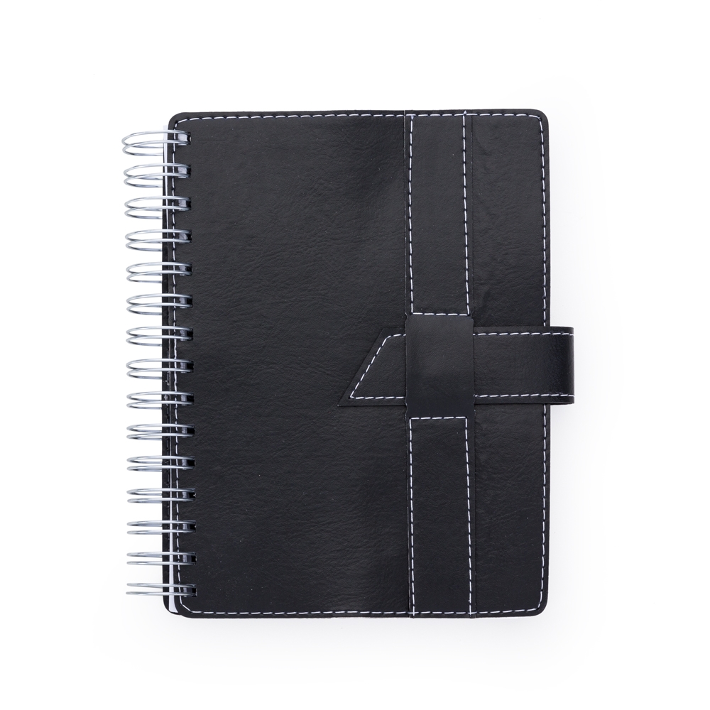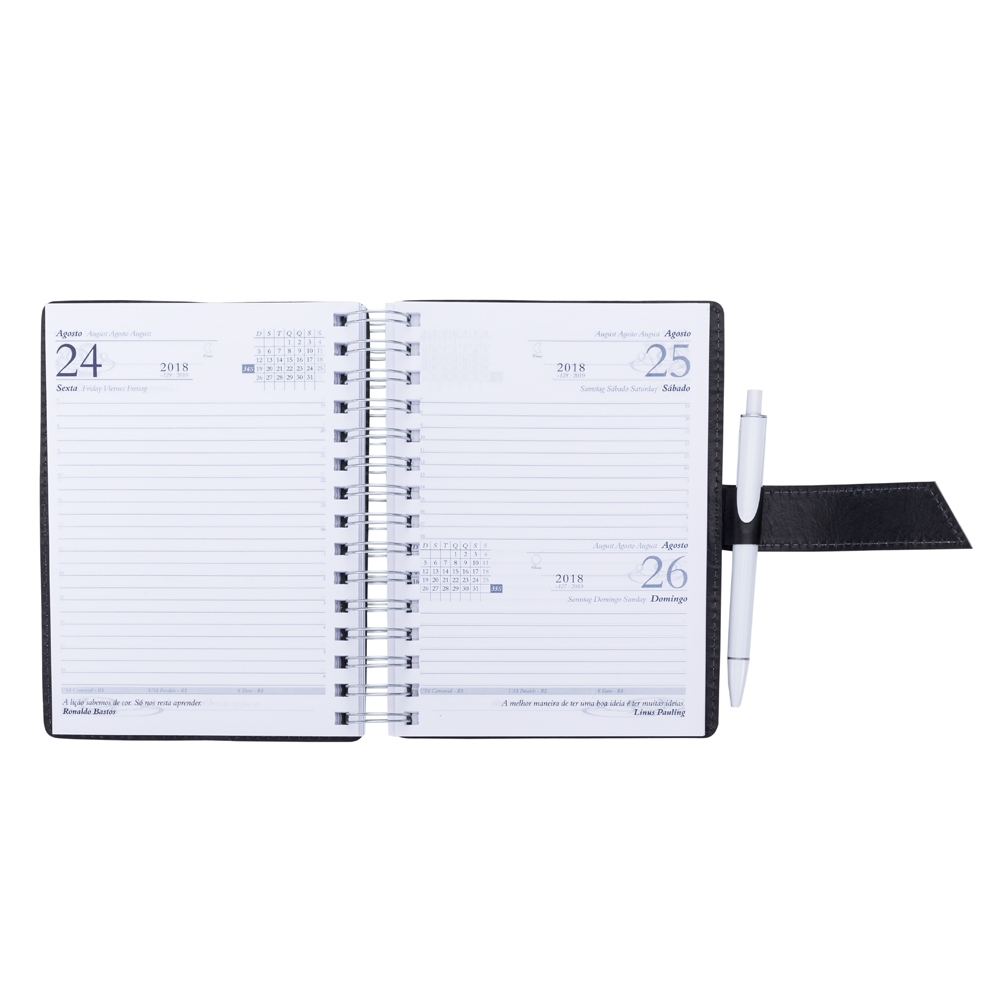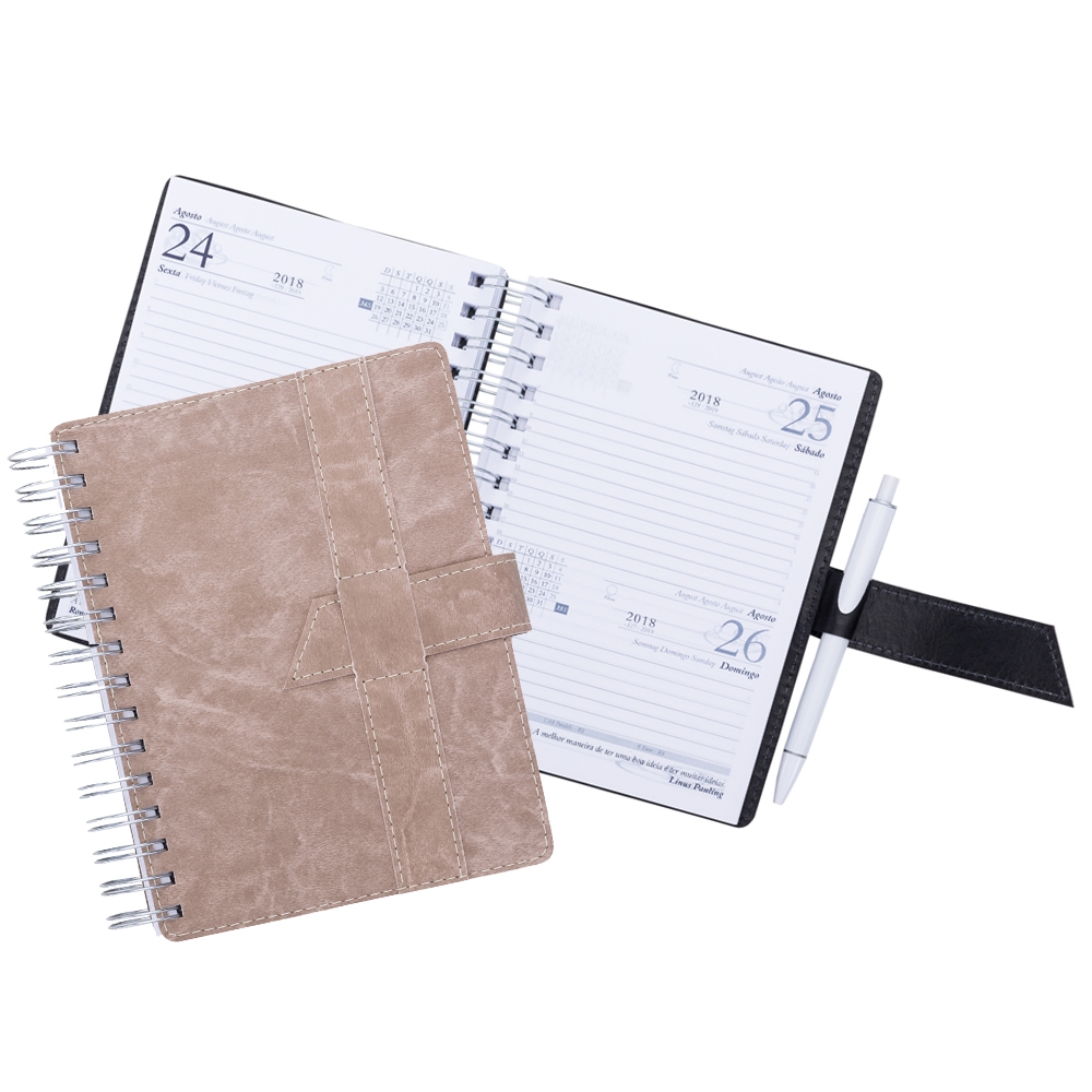 Agenda wire-o de couro sintético com fecho e suporte para caneta(não acompanha). Parte frontal com fecho no estilo "fivela" e verso liso, possui costura branca. Contém dados pessoais, calendário de 2017 à 2019, mapa do Brasil, mapa global, índice telefônico e planejamento.